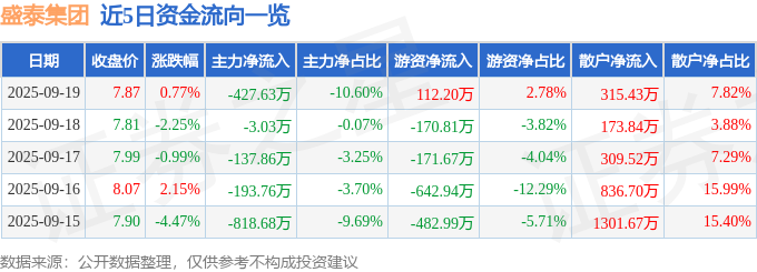 证券之星消息,截至2025年9月19日收盘,盛泰集团(605138)报收于7.87元,上涨0.77%,换手率0.93%,成交量5.18万手,成交额4033.04万元。