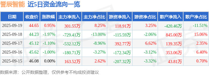 证券之星消息,截至2025年9月19日收盘,誉辰智能(688638)报收于44.65元,上涨0.95%,换手率3.12%,成交量8243.0手,成交额3653.92万元。