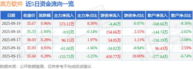 证券之星消息,截至2025年9月19日收盘,英方软件(688435)报收于35.67元,上涨0.96%,换手率4.03%,成交量1.9万手,成交额6852.76万元。