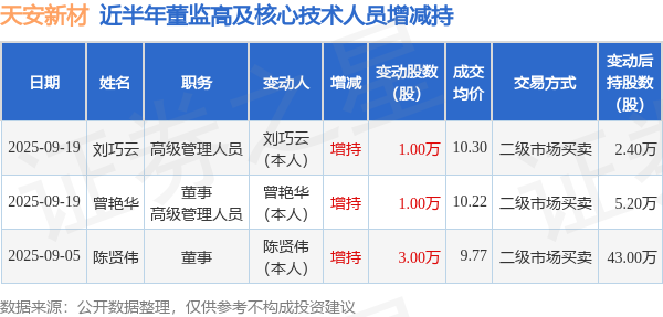 证券之星消息,根据9月19日市场公开信息、上市公司公告及交易所披露数据整理,天安新材(603725)最新董监高及相关人员股份变动情况:2025年9月19日公司董事,高级管理人员曾艳华、高级管理人员刘巧云共增持公司股份2.0万股,占公司总股本为0.0066%。变动期间公司股价下跌3.2%,9月19日当日收盘报10.29元。