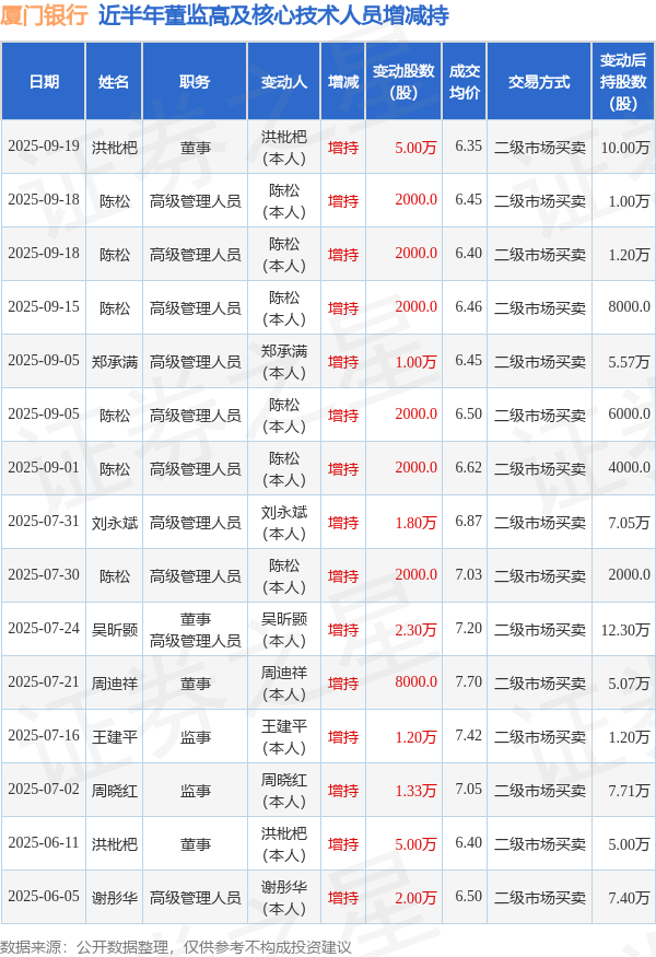 厦门银行近半年内的董监高及核心技术人员增减持详情如下: