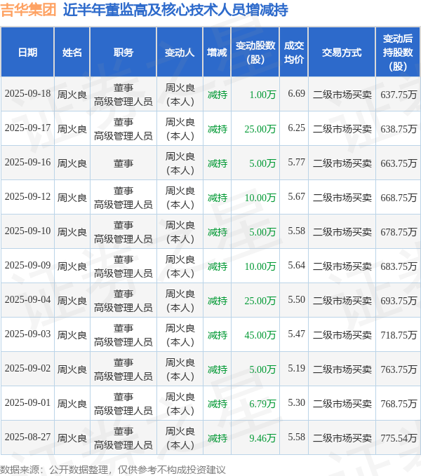 吉华集团近半年内的董监高及核心技术人员增减持详情如下: