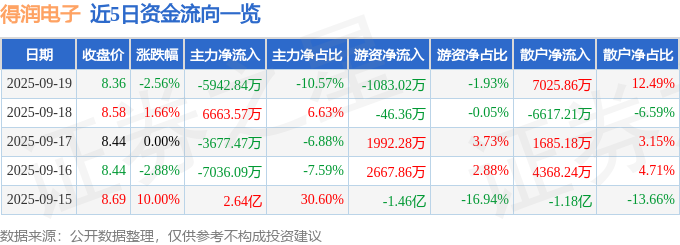 证券之星消息,截至2025年9月19日收盘,得润电子(002055)报收于8.36元,下跌2.56%,换手率11.17%,成交量66.35万手,成交额5.62亿元。