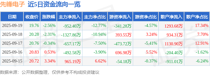 9月19日的资金流向数据方面,主力资金净流出952.4万元,占总成交额12.77%,游资资金净流出341.28万元,占总成交额4.57%,散户资金净流入1293.68万元,占总成交额17.34%。