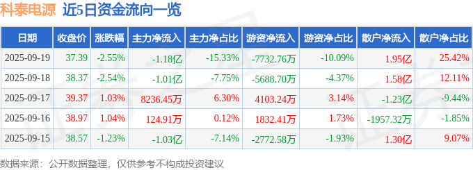 证券之星消息,截至2025年9月19日收盘,科泰电源(300153)报收于37.39元,下跌2.55%,换手率6.39%,成交量20.33万手,成交额7.66亿元。