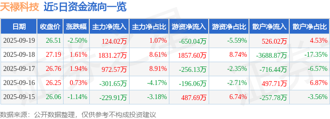 证券之星消息,截至2025年9月19日收盘,天禄科技(301045)报收于26.51元,下跌2.5%,换手率6.76%,成交量4.32万手,成交额1.16亿元。