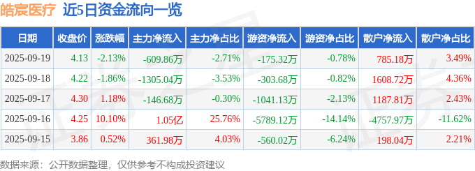 证券之星消息,截至2025年9月19日收盘,皓宸医疗(002622)报收于4.13元,下跌2.13%,换手率6.5%,成交量54.64万手,成交额2.25亿元。