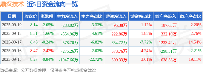 9月19日的资金流向数据方面,主力资金净流出283.02万元,占总成交额3.33%,游资资金净流入95.38万元,占总成交额1.12%,散户资金净流入187.63万元,占总成交额2.2%。