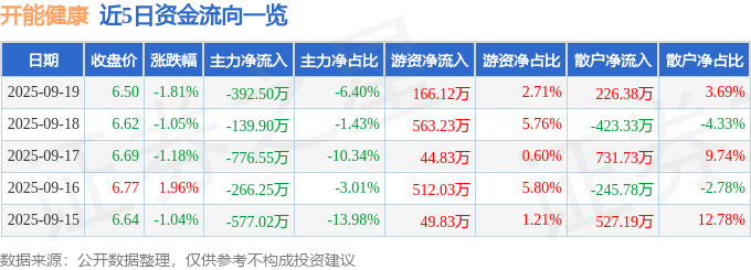 证券之星消息,截至2025年9月19日收盘,开能健康(300272)报收于6.5元,下跌1.81%,换手率2.02%,成交量9.4万手,成交额6133.08万元。