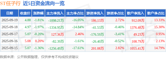 9月19日的资金流向数据方面,主力资金净流出1098.21万元,占总成交额16.05%,游资资金净流入186.13万元,占总成交额2.72%,散户资金净流入912.09万元,占总成交额13.33%。