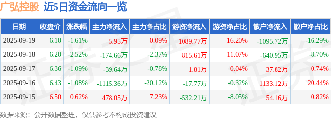 证券之星消息,截至2025年9月19日收盘,广弘控股(000529)报收于6.1元,下跌1.61%,换手率1.93%,成交量11.0万手,成交额6726.2万元。