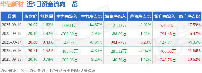 证券之星消息,截至2025年9月19日收盘,华信新材(300717)报收于20.07元,下跌1.62%,换手率2.02%,成交量2.06万手,成交额4150.93万元。