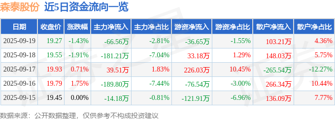 证券之星消息,截至2025年9月19日收盘,森泰股份(301429)报收于19.27元,下跌1.43%,换手率2.79%,成交量1.23万手,成交额2366.46万元。