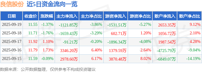 证券之星消息,截至2025年9月19日收盘,良信股份(002706)报收于11.55元,下跌1.37%,换手率2.75%,成交量25.13万手,成交额2.91亿元。