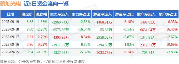证券之星消息,截至2025年9月19日收盘,聚灿光电(300708)报收于8.88元,下跌1.33%,换手率3.71%,成交量26.35万手,成交额2.36亿元。