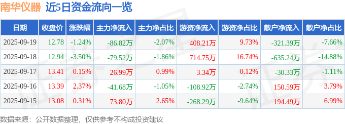 证券之星消息,截至2025年9月19日收盘,南华仪器(300417)报收于12.78元,下跌1.24%,换手率3.76%,成交量3.29万手,成交额4195.75万元。