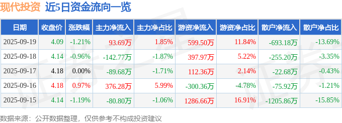 证券之星消息,截至2025年9月19日收盘,现代投资(000900)报收于4.09元,下跌1.21%,换手率0.81%,成交量12.36万手,成交额5064.62万元。