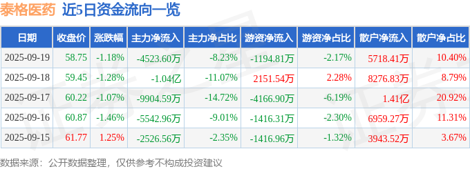 证券之星消息,截至2025年9月19日收盘,泰格医药(300347)报收于58.75元,下跌1.18%,换手率1.64%,成交量9.28万手,成交额5.5亿元。