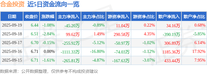 证券之星消息,截至2025年9月19日收盘,合金投资(000633)报收于6.44元,下跌1.08%,换手率2.04%,成交量7.85万手,成交额5056.02万元。
