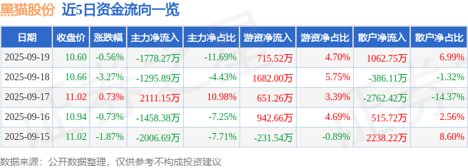 证券之星消息,截至2025年9月19日收盘,黑猫股份(002068)报收于10.6元,下跌0.56%,换手率1.95%,成交量14.32万手,成交额1.52亿元。