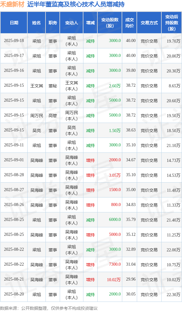 禾盛新材近半年内的董监高及核心技术人员增减持详情如下:
