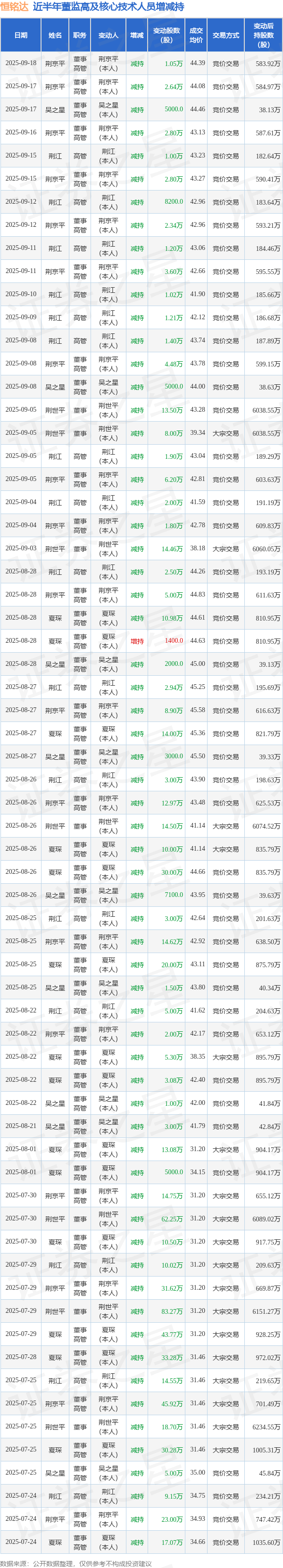 恒铭达近半年内的董监高及核心技术人员增减持详情如下: