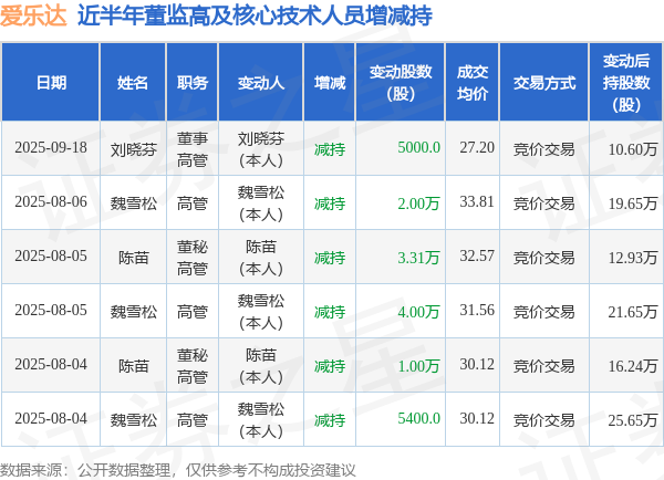 爱乐达近半年内的董监高及核心技术人员增减持详情如下: