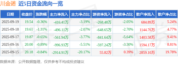 证券之星消息,截至2025年9月19日收盘,川金诺(300505)报收于19.54元,下跌0.36%,换手率3.07%,成交量6.67万手,成交额1.31亿元。