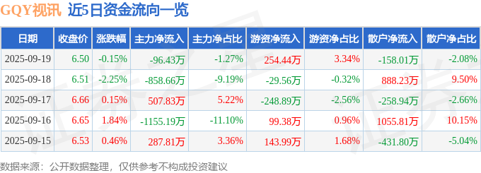 证券之星消息,截至2025年9月19日收盘,GQY视讯(300076)报收于6.5元,下跌0.15%,换手率2.77%,成交量11.74万手,成交额7608.37万元。