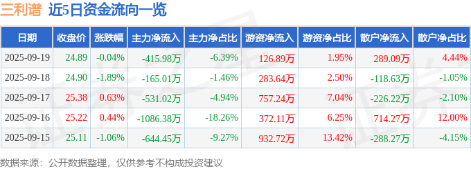 9月19日的资金流向数据方面,主力资金净流出415.98万元,占总成交额6.39%,游资资金净流入126.89万元,占总成交额1.95%,散户资金净流入289.09万元,占总成交额4.44%。