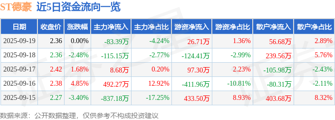 证券之星消息,截至2025年9月19日收盘,ST德豪(002005)报收于2.36元,上涨0.0%,换手率0.48%,成交量8.34万手,成交额1964.56万元。