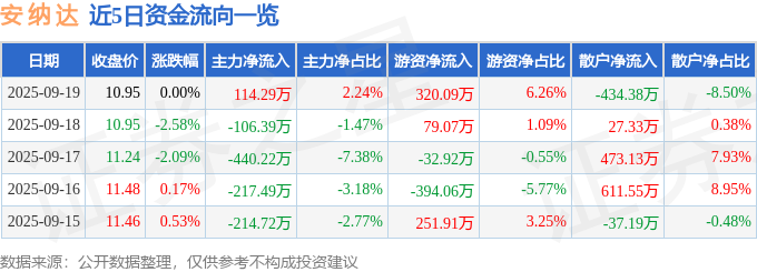 证券之星消息,截至2025年9月19日收盘,安 纳 达(002136)报收于10.95元,上涨0.0%,换手率2.18%,成交量4.68万手,成交额5112.54万元。