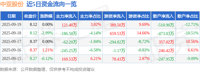 9月19日的资金流向数据方面,主力资金净流入121.4万元,占总成交额3.02%,游资资金净流入389.5万元,占总成交额9.69%,散户资金净流出510.9万元,占总成交额12.71%。
