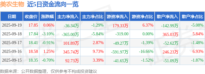 证券之星消息,截至2025年9月19日收盘,美农生物(301156)报收于17.85元,上涨0.06%,换手率2.12%,成交量1.58万手,成交额2813.63万元。