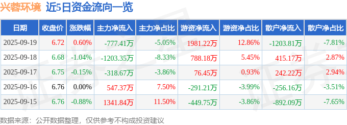 证券之星消息,截至2025年9月19日收盘,兴蓉环境(000598)报收于6.72元,上涨0.6%,换手率0.77%,成交量23.04万手,成交额1.54亿元。