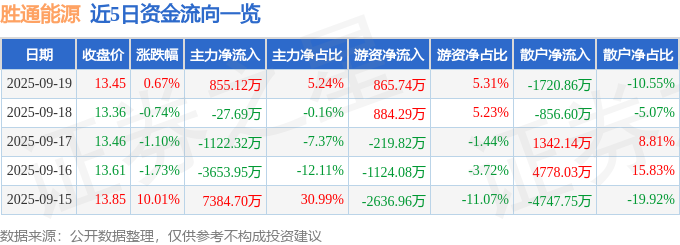 证券之星消息,截至2025年9月19日收盘,胜通能源(001331)报收于13.45元,上涨0.67%,换手率7.19%,成交量12.08万手,成交额1.63亿元。