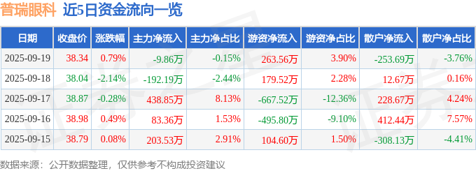 证券之星消息,截至2025年9月19日收盘,普瑞眼科(301239)报收于38.34元,上涨0.79%,换手率1.19%,成交量1.78万手,成交额6753.84万元。