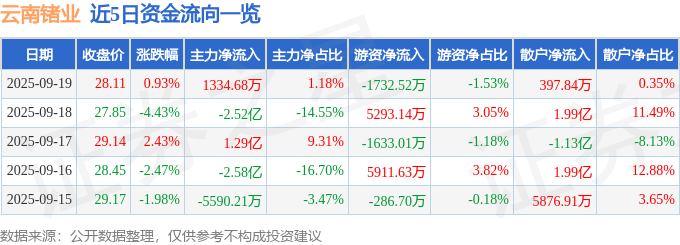 证券之星消息,截至2025年9月19日收盘,云南锗业(002428)报收于28.11元,上涨0.93%,换手率6.2%,成交量40.5万手,成交额11.31亿元。