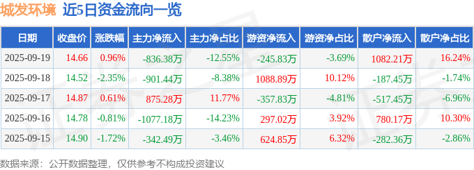 9月19日的资金流向数据方面,主力资金净流出836.38万元,占总成交额12.55%,游资资金净流出245.83万元,占总成交额3.69%,散户资金净流入1082.21万元,占总成交额16.24%。