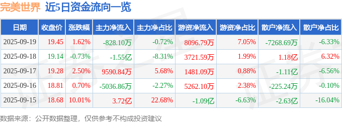 证券之星消息,截至2025年9月19日收盘,完美世界(002624)报收于19.45元,上涨1.62%,换手率3.24%,成交量59.29万手,成交额11.48亿元。