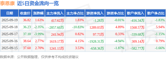 证券之星消息,截至2025年9月19日收盘,泰恩康(301263)报收于36.82元,上涨1.63%,换手率2.04%,成交量6.19万手,成交额2.28亿元。
