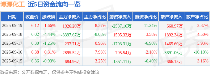 证券之星消息,截至2025年9月19日收盘,博源化工(000683)报收于6.12元,上涨1.66%,换手率1.13%,成交量37.61万手,成交额2.3亿元。