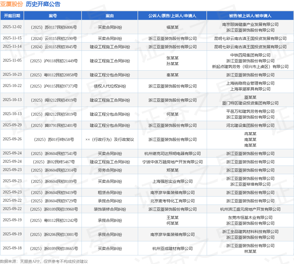 案号:(2025)浙0604民初9729号根据统计,近一年内以浙江亚厦装饰股份有限公司为当事人的历史开庭公告有547则,其中案由为“买卖合同纠纷”的公告以174则居首,其次为“劳务合同纠纷”有107则,“建设工程施工合同纠纷”有68则。历史开庭公告(前20条)如下: