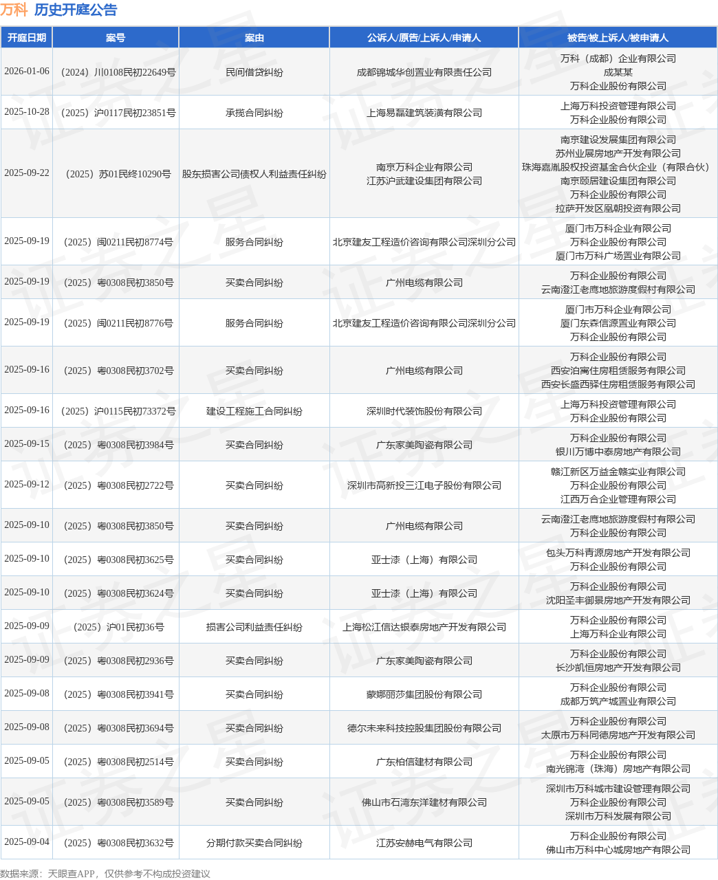 案号:(2025)苏01民终10290号根据统计,近一年内以万科企业股份有限公司为当事人的历史开庭公告有368则,其中案由为“买卖合同纠纷”的公告以226则居首,其次为“建设工程施工合同纠纷”有28则,“合同纠纷”有17则。历史开庭公告(前20条)如下:
