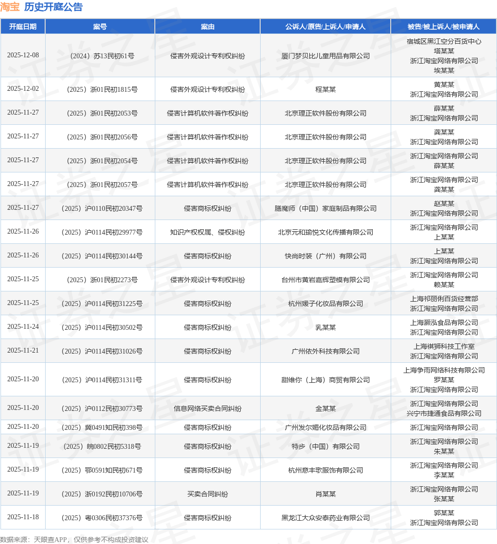 案号:(2025)陕0113知民初486号根据统计,近一年内以浙江淘宝网络有限公司为当事人的历史开庭公告有7891则,其中案由为“侵害商标权纠纷”的公告以3442则居首,其次为“网络服务合同纠纷”有890则,“侵害外观设计专利权纠纷”有567则。历史开庭公告(前20条)如下: