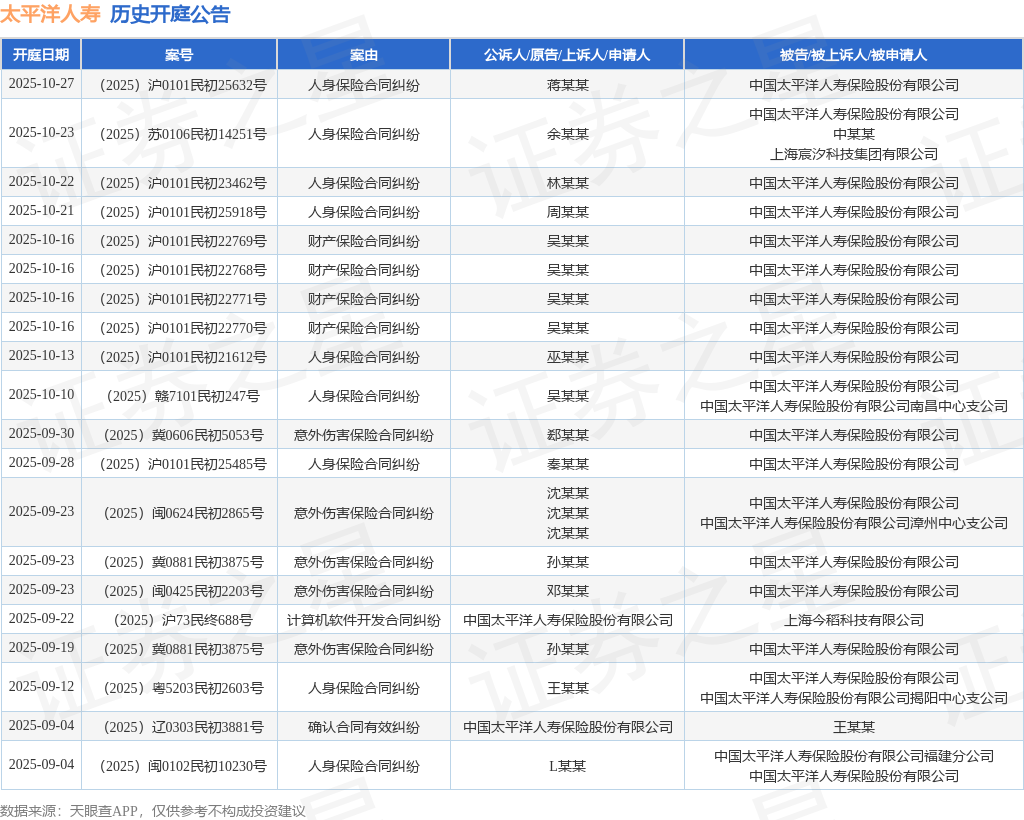 案号:(2025)沪73民终688号根据统计,近一年内以中国太平洋人寿保险股份有限公司为当事人的历史开庭公告有162则,其中案由为“人身保险合同纠纷”的公告以105则居首,其次为“意外伤害保险合同纠纷”有15则,“保险纠纷”有14则。历史开庭公告(前20条)如下: