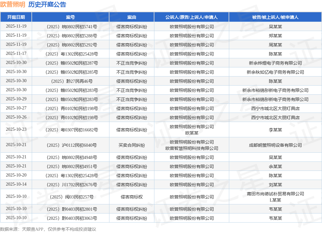 案号:(2025)赣0502知民初289号根据统计,近一年内以欧普照明股份有限公司为当事人的历史开庭公告有619则,其中案由为“侵害商标权纠纷”的公告以524则居首,其次为“侵害商标权”有26则,“商标权权属、侵权纠纷”有26则。历史开庭公告(前20条)如下: