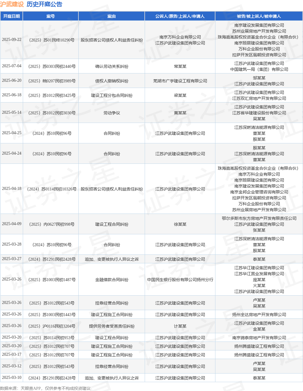案号:(2025)苏01民终10290号根据统计,近一年内以江苏沪武建设集团有限公司为当事人的历史开庭公告有44则,其中案由为“建设工程施工合同纠纷”的公告以6则居首,其次为“合同纠纷”有6则,“挂靠经营合同纠纷”有4则。历史开庭公告(前20条)如下: