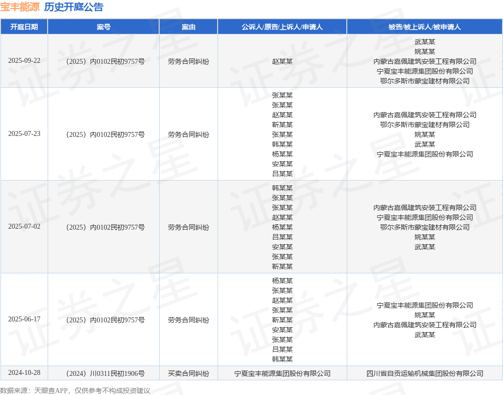 根据统计,近一年内以宁夏宝丰能源集团股份有限公司为当事人的历史开庭公告有5则,其中案由为“劳务合同纠纷”的公告以4则居首,其次为“买卖合同纠纷”有1则。历史开庭公告如下: