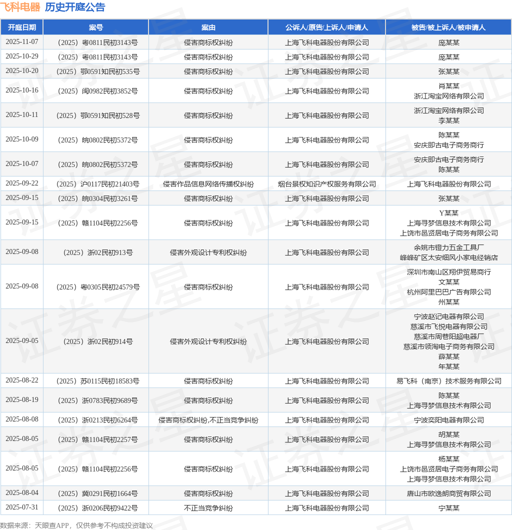 案号:(2025)沪0117民初21403号根据统计,近一年内以上海飞科电器股份有限公司为当事人的历史开庭公告有315则,其中案由为“侵害商标权纠纷”的公告以245则居首,其次为“不正当竞争纠纷”有18则,“侵害外观设计专利权纠纷”有14则。历史开庭公告(前20条)如下: